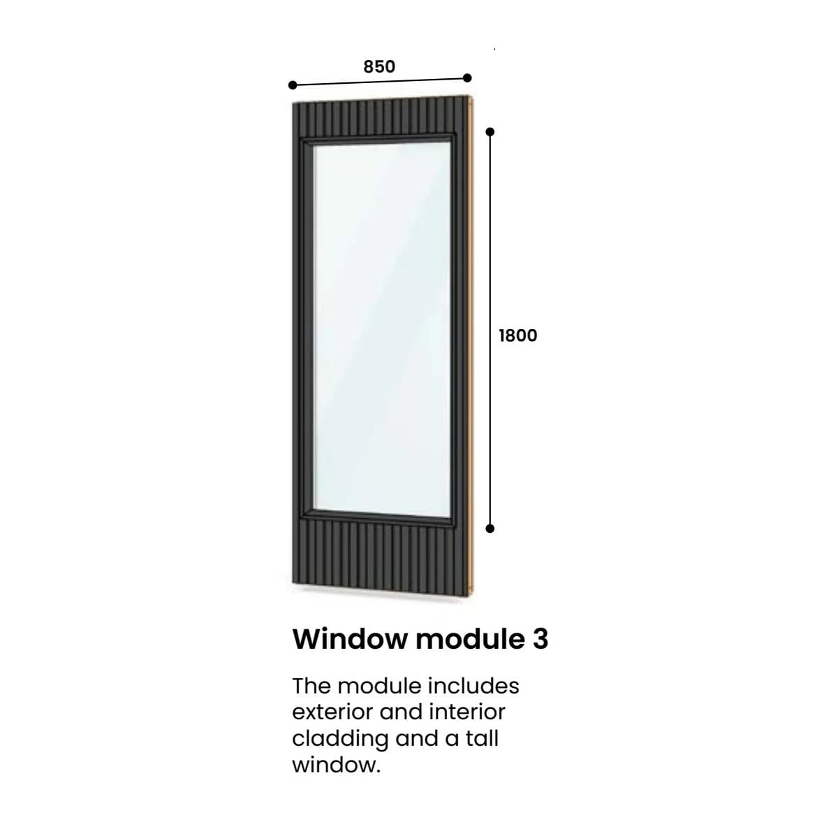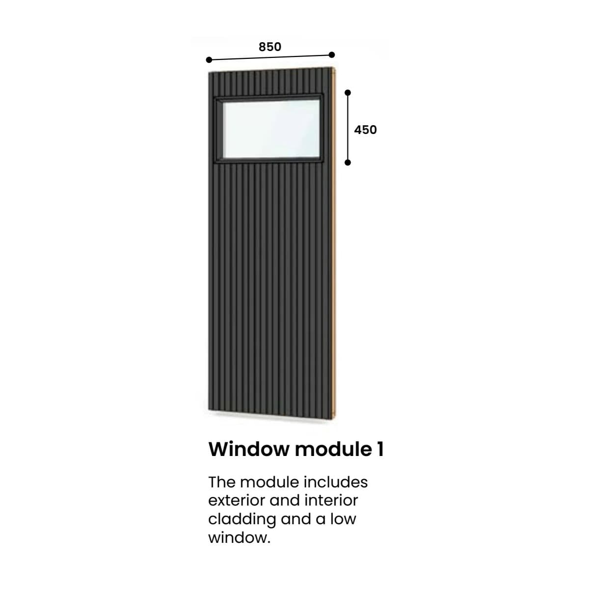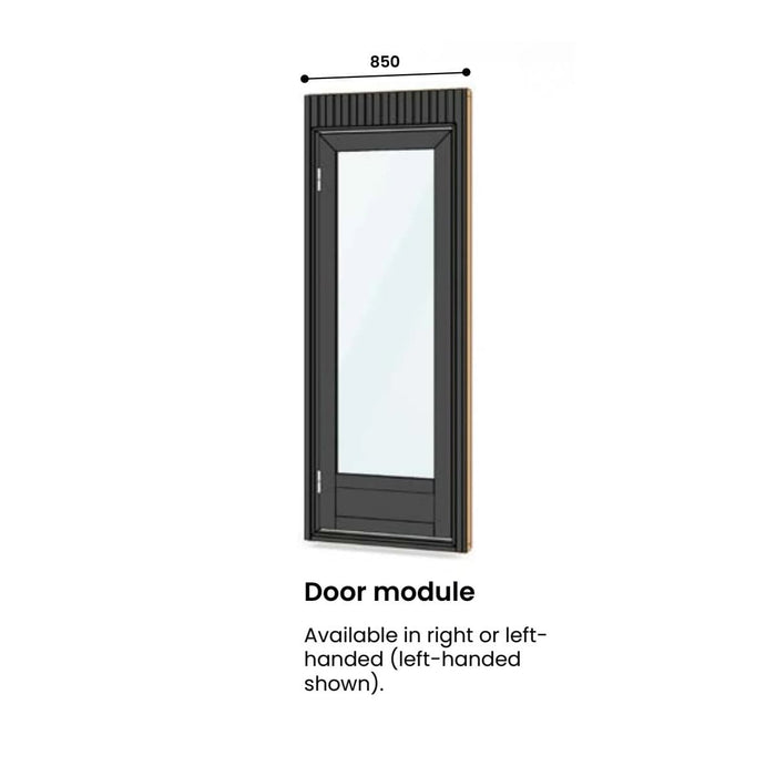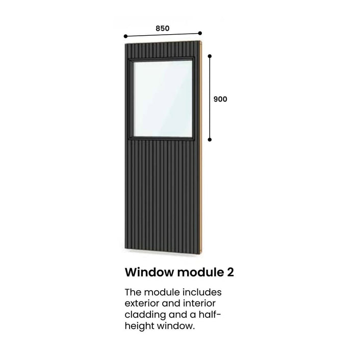 The modular system offers versatile options: two solid wall panels, three window panels in different sizes, and a door panel available in both right-hand and left-hand versions. The floor and ceiling are seamlessly built into the frame, ensuring durability and stability.