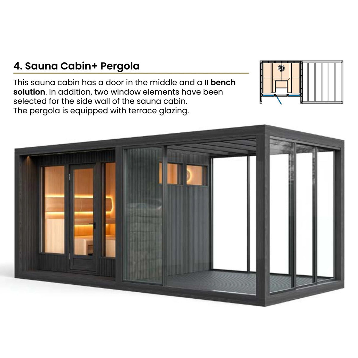 Every TAIVE outdoor sauna comes with high-quality TAIVE benches, available in four thoughtfully designed, ready-made packages. The popular L and J models are offered in both right-hand and left-hand configurations to suit different layouts.