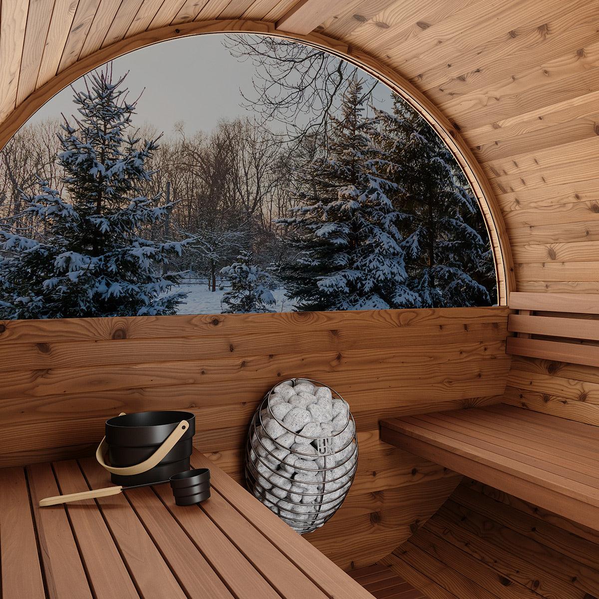 4-person, premium-quality DIY Barrel Sauna Kit with front porch and panoramic window. Tall enough to stand in comfortably, this is the largest, most spacious barrel sauna available. Natural light from the glass door and panoramic window illuminates this beautiful space. Includes a front porch with comfortable benches for added convenience. Quality materials and superb engineering make this the very best outdoor sauna. Sauna heater not included.