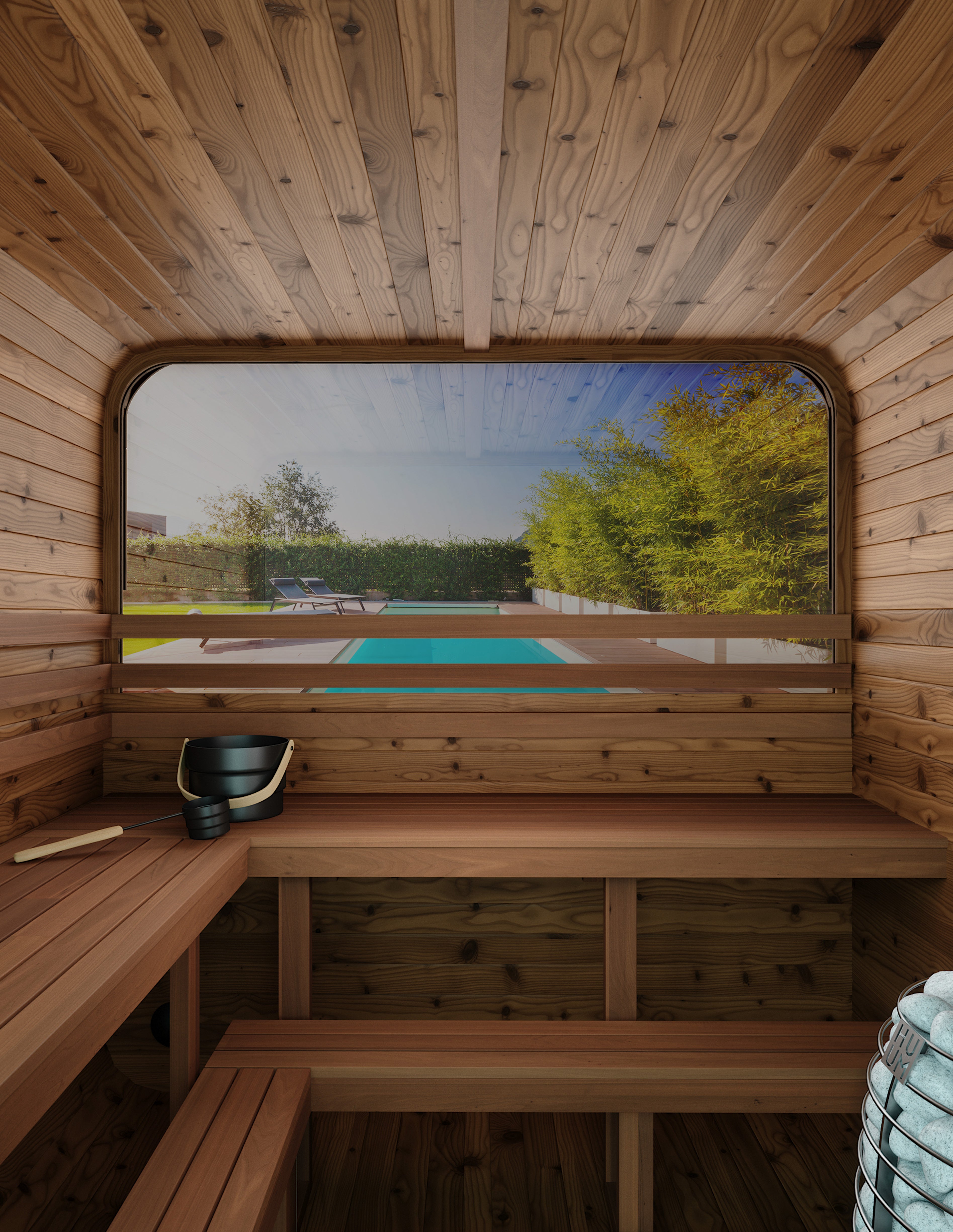 Nordic spruce gets a fresh look in a square silhouette with curved contours. Take in the view from the full tempered-glass front of your Thermory Sauna Square while you rest your feet on the tiered bench. Go ahead, stay awhile.