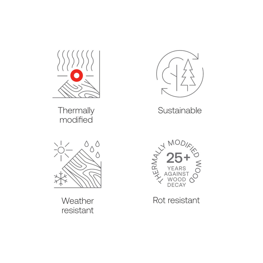 Thermally modified Nordic spruce never shrinks for unmatched durability and stability, along with 25 years of proven rot resistance.