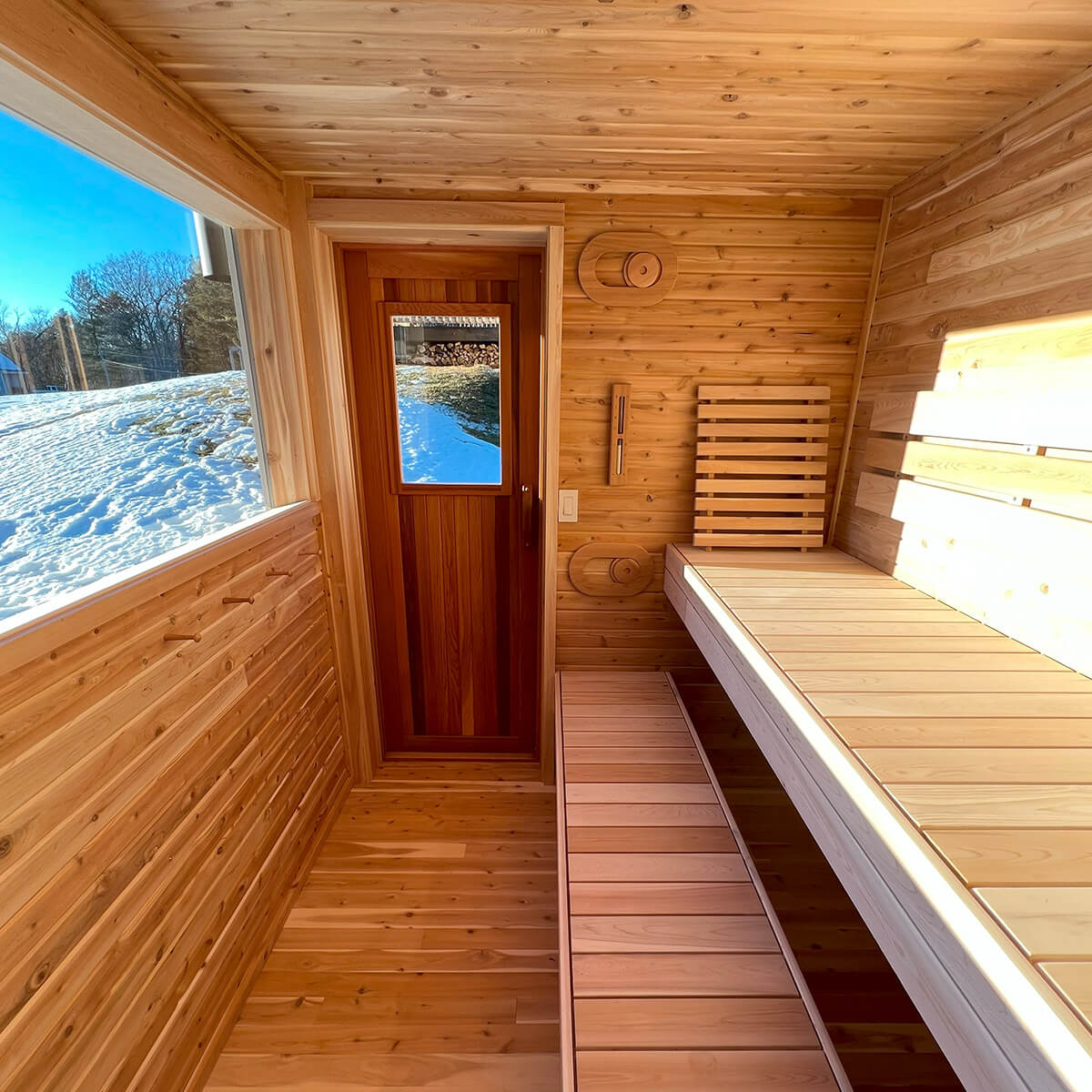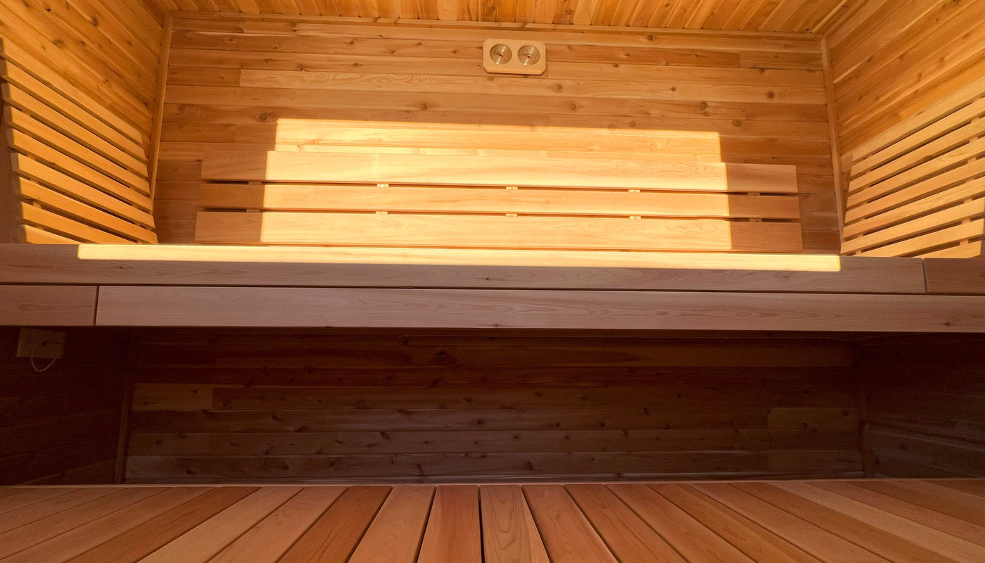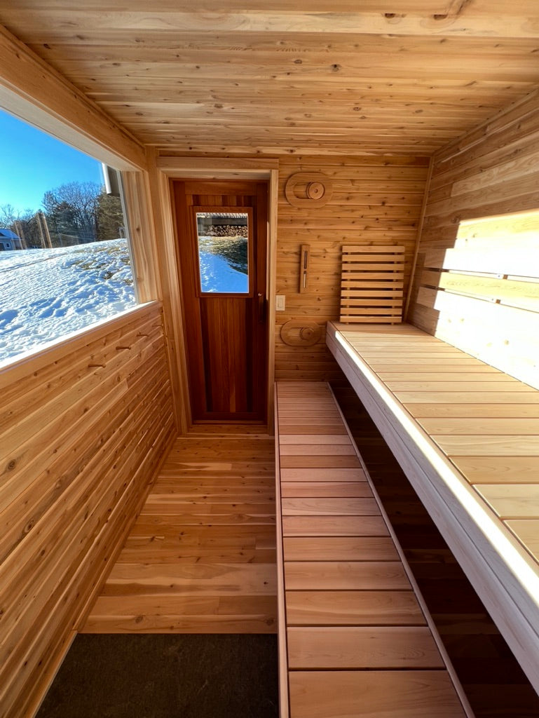 To enhance your comfort, the sauna boasts spacious 9 ft. clear cedar benches, thoughtfully designed for relaxation and rejuvenation. The natural aroma of cedar adds to the serene atmosphere, creating a sensory journey for your senses.